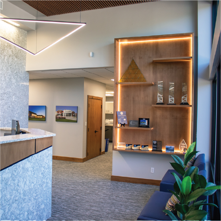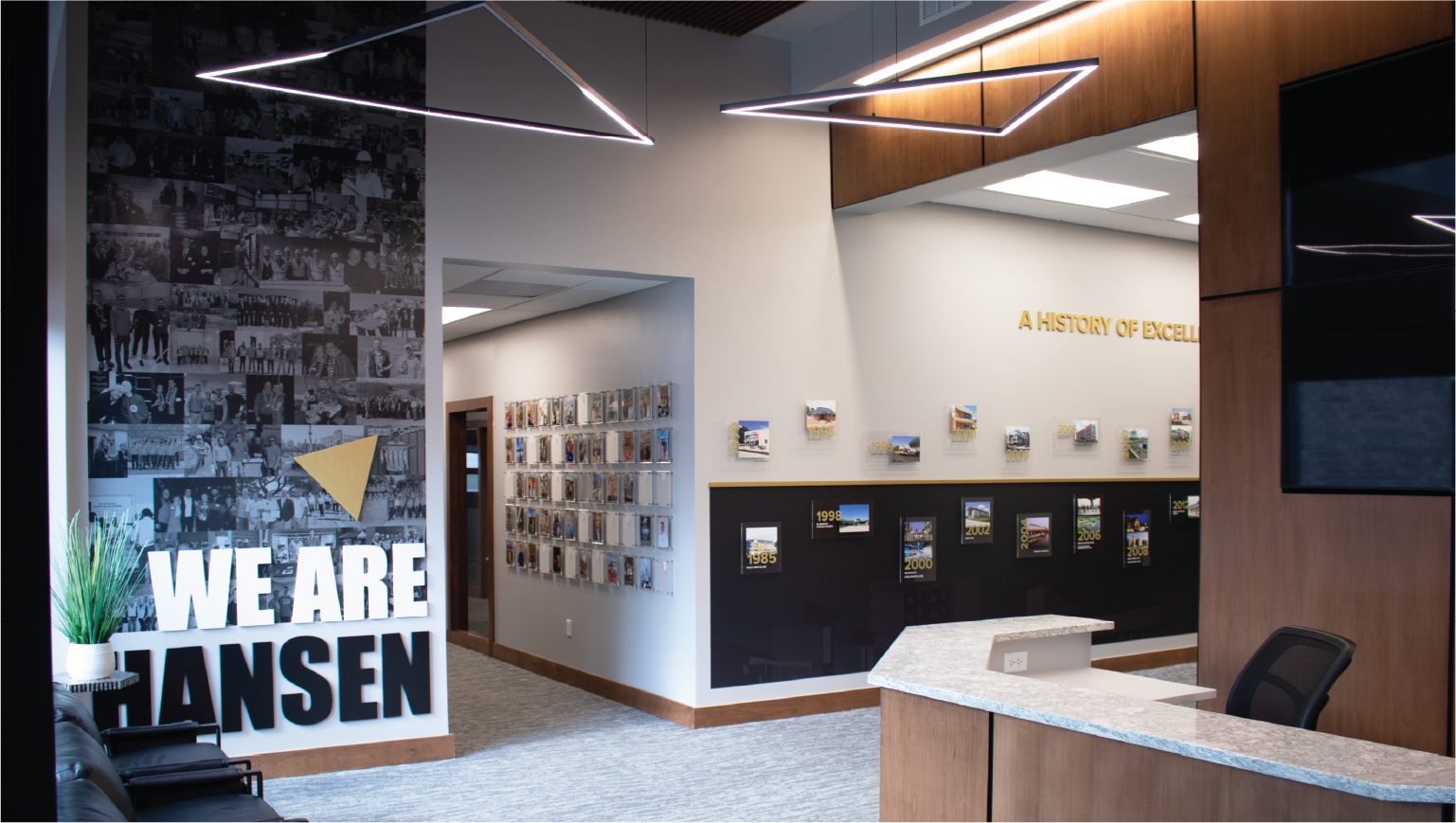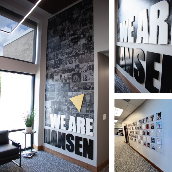 From the pre-demolition phase onward, 818 collaborated closely with the Hansen team to create a space they’d love to work in. Every immersive feature was intentionally designed to reflect who Hansen is—welcoming, trustworthy, and bold. From the timeline wall to the exterior signage, you can experience Hansen’s excellence at every angle.