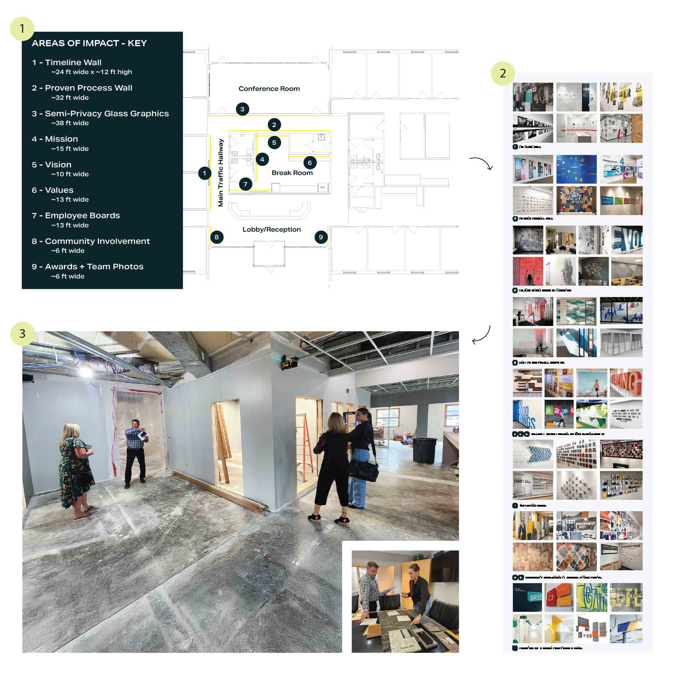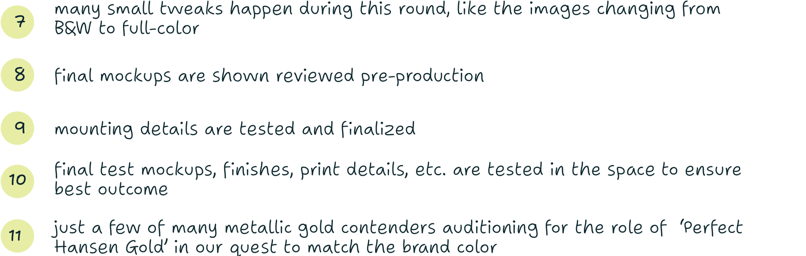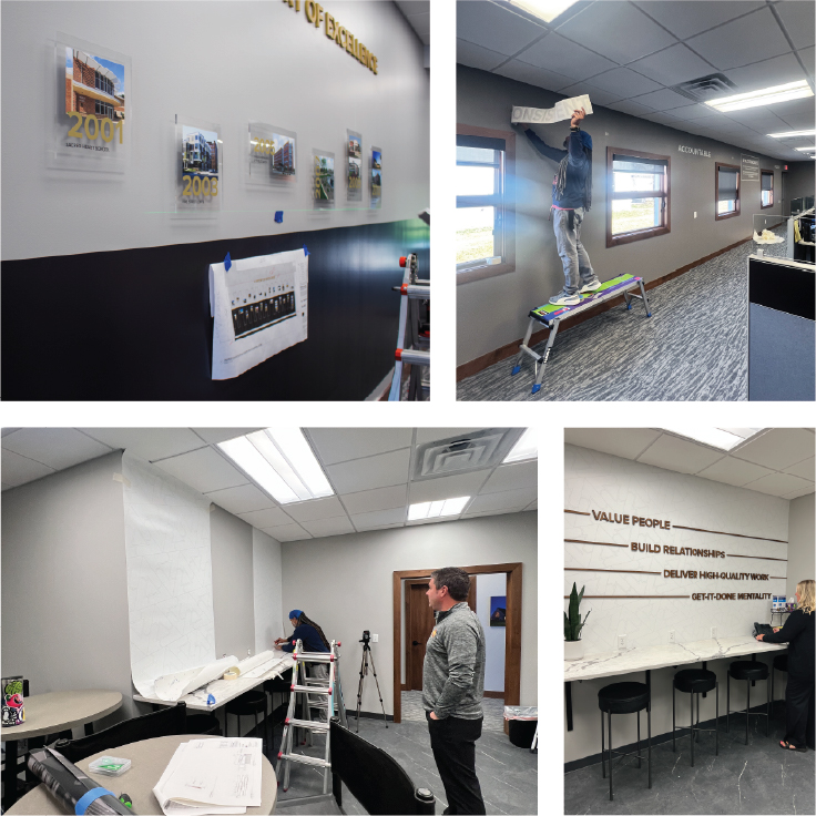After finalizing the last of the design details, we begin the final phase with Vendor Coordination. We collaborate with vendors on printing, fabrication, and installation quotes for the client’s final approval, ensuring no detail is overlooked before moving into Production and Installation. Once our design team and the client have approved the final proofs, we schedule a date for one of our favorite parts of the process: installation day, where we meet with the vendor on-site to answer questions, oversee key moments of the installation, and document the process. Larger projects sometimes require professional photography or videography to fully capture the breadth of the work, which involves a separate visit at the client’s convenience.